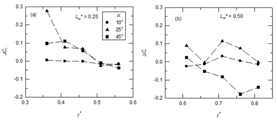 The differences in the sectional lift coefficients (Cl) at different x-z planes at different angles of attack. The wing model was equipped with an alula-VG at different y-positions: (a) Lw* = 0.25 (r* = 0.37), (b) Lw* = 0.50 (r* = 0.62).