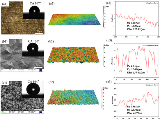 The contact angle of the SC is 164° shown in Figure 2(c1) inset, which indicates that the SC surface is superhydrophobic. The second column of Figure 2 shows the surface microscopic images of the three specimens: the BS surface is flat, the ES surface has uneven pits due to electrochemical etching, and the SC surface has a distinct peak and valley shape after the deposition of carbon soot particles. The third column of Figure 3 shows the results of the surface roughness analysis of the specimens, respectively. It can be found that the highest values of arithmetic mean deviation of contour Ra and microscopic unevenness decimal height Rz of ES are 4.836 μm and 22.600 μm, respectively, due to electrochemical etching, indicating that it has the roughest surface. In contrast, the smallest value of the contour cell mean width RSm of SC is 4.792 μm, reflecting the higher density of deposited carbon soot particles on the surface of SC.