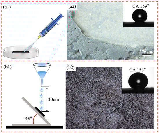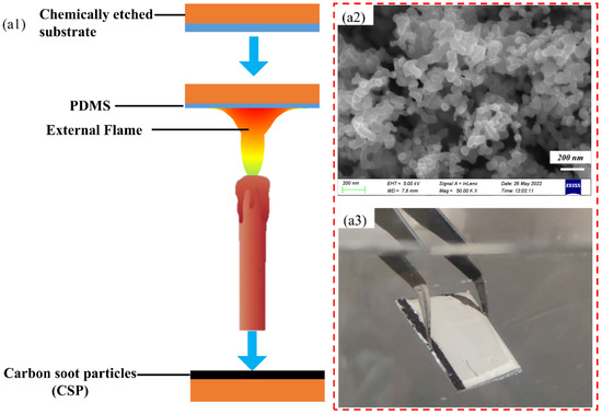Figure 3(a1,a2) display the process of producing ES sample by electrochemical etching. Figure 3(a3) shows the results after etching, and it can be seen that there are obvious gully-like microstructures on the surface of ES. The non-smooth microstructure feature can not only trap some air, create the condition for the formation of superhydrophobic character, but also provide a place for the deposition of soot particles. After obtaining ES as shown in Figure 3 above, the PDMS-coated ES was further placed in the middle of the incomplete burning candle flame by direct deposition method to capture hydrophobic soot particles. Since the brushed PDMS mixture is a flat and thin layer, part of the PDMS mixture will penetrate into the etched substrate and will be instantly solidified when burned by the flame, and at the same time, the loose carbon soot particles can be tightly anchored to the surface of the substrate, and the carbon soot particles can completely cover the PDMS surface in the form of embedded or semi-embedded, so there would not be a violent PDMS burning phenomenon.