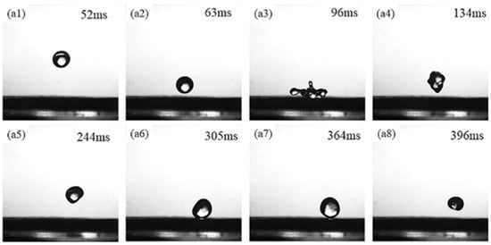 As shown in Figure 5(a1–a8), just like rain droplets bouncing on lotus leaves in nature, the impacting droplets first spread out on the surface to their maximum diameter, then they contract to a certain extent and eventually bounce off the surface. The water droplets underwent the motion process of spreading, shrinking, bouncing back, and rolling down on the prepared superhydrophobic coating. Due to the rough and distributed porous micromorphology on the SC surface, it can trap air near its surface and form air pockets, resulting in a stable Cassie-Baxter composite contact interface [35]. The water droplets cannot exclude the trapped air when they touch the SC surface. During the water droplet spreading phase (Figure 5(a3)), a sub-stable Cassie-Baxter contact state is formed because of the pressure inside the water droplet. In the subsequent shrinkage phase (Figure 5(a4)), a recovery from the sub-stable state to the stable Cassie-Baxter contact state is achieved. The air captured the external atmospheric pressure during the droplet rebound balances (Figure 5(a5)), thus reducing the viscous resistance of the droplet during its motion on the superhydrophobic surface. This allows the droplet to rebound and roll off from the surface (Figure 5(a6–a8)). According to the above analysis, the rebound phenomenon of the impacting droplet on the surface of the SC reflects the excellent dynamic water repellency of the prepared coating.