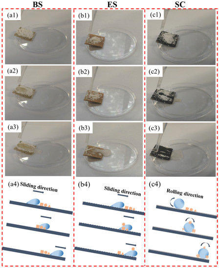 Self-cleaning tests and schematic diagrams on BS, ES, and SC against solid contaminants: (a1–a3) test process on BS; (b1–b3) test process on ES; (c1–c3) test process on SC; (a4,b4,c4) show the schematic diagrams of the interaction mode with the water droplets and the contaminant particles on BS, ES, and SC, respectively.