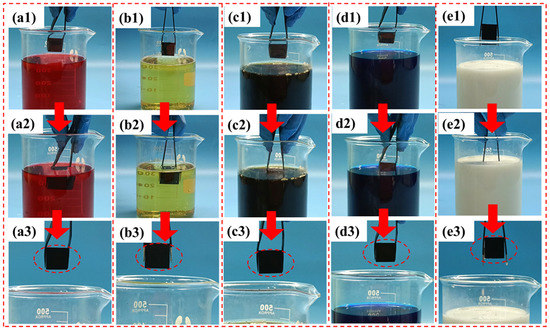 The self-cleaning property of the coating was examined by comparing the accumulation of liquid contaminants on the surface of the superhydrophobic coating before and after immersion in common household liquid solutions. As shown in Figure 7, the superhydrophobic coating was clean before immersion in liquid contaminants. Subsequently, the superhydrophobic coating was removed after being immersed in different liquid contaminants and the surface of the coating was still clean. Video S3 contains more details. As described in the video, the results are similar to those shown in reference [39], and the coating also performs well against contaminated liquids.