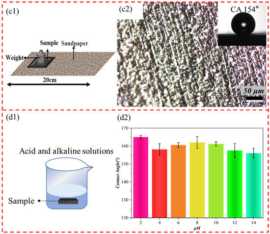 As shown in Figure 8(d2), the coating still maintained a contact angle greater than 150° compared with the coating before the test, and the super-hydrophobicity did not disappear. The above tests show that the prepared superhydrophobic coating can survive in this acidic and alkaline environment and possesses excellent chemical durability.