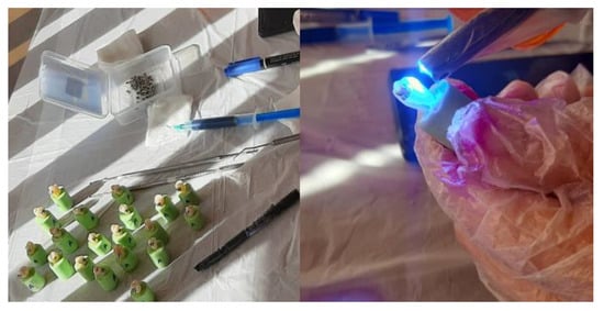 - Farzanegan, F.; Shafaee, H.; Darroudi, M.; Rangrazi, A. Effect of the Incorporation of Chitosan and TiO2 Nanoparticles on the Shear Bond Strength of an Orthodontic Adhesive: An In Vitro Study. J. Adv. Oral Res. 2021, 12, 261–266. [Google Scholar] [CrossRef]