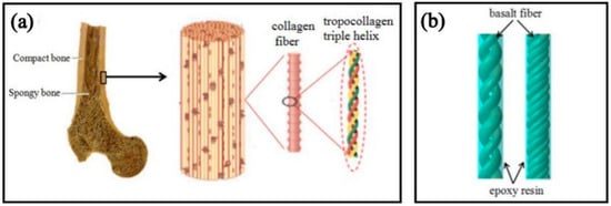 (a) Hierarchical structure of the bone []; (b) tropocollagen-inspired basalt fiber reinforced helical composite spring model.