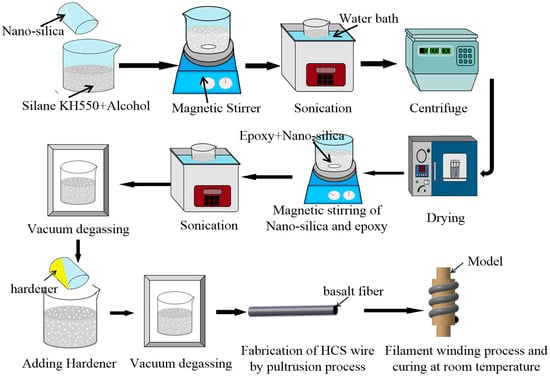 The whole process is shown schematically in Figure 2. Nano-silica tends to agglomerate because of its high surface energy. To break the NS agglomerates, the nanoparticles were suspended in the mixture solution of silane coupling agent KH550 and ethanol and subjected to magnetic stirring for 40 min at first. Then, the suspension was subjected to bath sonication at room temperature for 30 min. Thirdly, the mixture solution was dialyzed by a high-speed centrifuge for 1 min. Next, the surface-treated NS was obtained by storing and grinding. The surface-treated NS was mixed with the epoxy and subjected to magnetic stirring at 40 °C for 40 min. After magnetic stirring, the suspension was sonicated using a sonicating bath for 30 min to ensure uniform dispersion of NS and subjected to vacuum degassing. The hardener was added to the suspension in the ratio of 3:10 by weight, and the air bubbles were removed from the solution. Then, the continuous basalt fibers were wetted by the application of a matrix and pulled into the hose by using pultrusion. In this step, basalt roving was directly pultruded into a fixed-size silicone hose to obtain a unidirectional fiber bundle(U-FB). If the spiral structure of collagen fiber was imitated, the same amount of basalt twists less roving was divided into two- and four-fiber bundles to obtain two strands of the braided-fiber bundle (TS-BFB) and four strands of the braided-fiber bundle (FS-BFB). Finally, the preformed HCS samples were winded onto a mold to be completely cured for 8 h at room temperature.