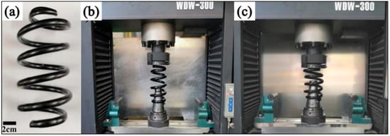 Figure 3a shows the experimental samples of an HCS (height = 200 mm, diameter = 12 mm, medium diameter = 90 mm). The stiffness tests were conducted with an electronic universal testing machine (WDW-300) at a compression speed of 1 mm/min. Figure 3b,c shows the experimental setup for measuring the mechanical properties of the HCS samples. According to JIS B2704, the spring stiffness is determined by the two endpoints between 30–70% of the deformation under the test load.