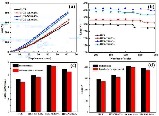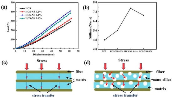 Figure 4a is the load-displacement curve of the static stiffness tests of the HCS with different NS content, and Figure 4b is the calculated stiffness change curve of the HCS. It can be seen from the figure that as the NS content increased, the stiffness gradually increased. When the NS content was 0.4 wt%, the stiffness of the HCS reached the maximum. As shown in Table 1, the spring stiffness value increased from 4.8 N/mm to 7.3 N/mm, an increase of 52.1%. Rasol HA et al. [] concluded that the stiffness of the carbon fiber spring is 5.66, and the HCS containing 0.4 wt% NS has a significantly higher stiffness than the carbon fiber spring. The excellent stiffness of the HCS with 0.4 wt% NS could be attributed to the combined results of the two mechanisms. Firstly, adding NS can increase the strength of the matrix. Secondly, proper wettability makes the interface between the matrix and the fiber have good adhesion. The superior matrix strength may be due to the effective transfer of stress from the matrix phase to the NS through the NS/epoxy interface. The fact that NS enhanced the strength of the epoxy resin matrix may be based on two reasons []: the bonding strength and the interface area of the NS/epoxy resin. The interface bonding strength of the NS/epoxy resin mainly depends on the various chemical, physical, and mechanical interactions between NS particles and epoxy resin. However, the NS/epoxy interface area is the main reason for adding NS content in fiber composites to increase the strength. The addition of NS promoted the formation of a high specific surface area so that the inside of the HCS wire had a very high interface area. The existence of such a large interface area enabled the stress to be transferred from the epoxy matrix to the NS particles (the schematic diagram of the stress transfer is shown in Figure 4c,d), which enabled the NS-reinforced fiber composites to withstand more force than unreinforced ones. In addition to the existence of interfacial stress transfer, due to the physical adsorption phenomenon [], the adhesion of nanofillers on epoxy made them stronger than pure epoxy.