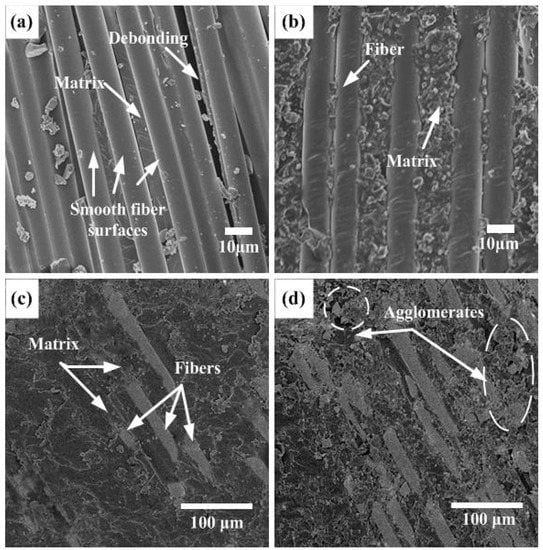 Figure 7 shows SEM micrographs of the adhesion between fibers/matrix with NS particle contents of (0, 0.2, 0.4, and 0.6 wt%). Basalt-fiber-reinforced HCS without NS has a smooth microscopic surface structure, as illustrated in Figure 7a. A smooth fiber surface without any matrix phase shows fiber/matrix debonding which is attributed to poor interfacial bonding. The fiber/matrix debonding reduces their load-carrying capacity and leads to a decrease in the stiffness of the HCS. Figure 7b shows the micro interface of the HCS modified by 0.2 wt% NS. There is no debonding between fiber/matrix, which attributes the matrix adhesion to be enhanced by adding NS particles. In the HCS with an NS content of 0.4 wt%, a good fiber/matrix interfacial bonding can be observed, and the surface of the fiber is covered with a layer of epoxy, as shown in Figure 7c. The uniform distribution of NS particles within the epoxy system results in an effective transfer of load between matrix and particles. Simultaneously, the freedom of fibers is limited by the epoxy matrix, which is coated on the fiber surface, leading to enhanced stiffness of the HCS. As shown in Figure 7d, in the case of 0.6 wt% NS, the particles tend to form agglomerates that reduce the NS/epoxy interfacial area. Thus, the stress transfer becomes less effective, and eventually, the stiffness of the NS-enhanced HCS decreases.