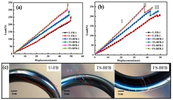 Figure 8a shows the load-displacement curves of three different HCS. It can be seen from the figures that the spring compression properties are basically stable. The mean spring stiffness, maximum compression load, and maximum compression displacement of the spring are listed in Table 2. As a result, the mean maximum compression load of HCS samples with U-FB, TS-BFB, and FS-BFB were 233 N, 264.5 N, and 301 N, respectively. The mean stiffness of the test HCS samples with U-FB, TS-BFB, and FS-BFB were 4.57 N/mm, 5.51 N/mm, and 6.55 N/mm, respectively. The maximum load of FS-BFB HCS increased by 29.2%, while the spring stiffness showed a 44% improvement compared with the U-FB HCS. The improvement of spring compression performance by the braided outer layer was also found to be only about 18% in other studies [], which in some way reinforces the superiority of FS-BFB. This advantage may stem from the fact that the interwoven fiber bundles increase the transverse fiber content of the spring wire, thus improving the shear resistance of the wire. The more braided strands there are, the greater the transverse fiber content of the spring wire, the stronger the shear resistance of the spring wire. In addition, there were many interweaving points inside the interwoven fiber bundles. The existence of the interwoven points played a role in restraining the deformation of the fiber along the load direction. The less deformation of the wire spring under the same load, the higher the spring stiffness will be. More fiber strands lead to more interwoven points, which in turn lead to greater spring stiffness and stronger load-bearing capacity. The fluctuation of the curve of the braided fiber bundle structure is larger than that of the unidirectional fiber bundle, which may be caused by the uneven distance of the inner interwoven points of the spring wire.