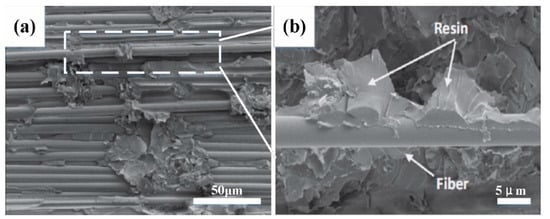 Figure 9a shows the SEM image at the crack. Figure 9b shows the enlarged view of the fracture area, showing the resin-enriched area is more brittle and prone to cracking, and the appearance of the crack leads to the debonding of the fiber, which reduces the compression performance of the composite spiral spring.