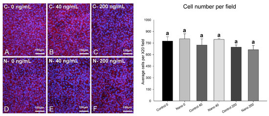Epifluorescence imaging (left panel) and cell number per field (right panel) of MC3T3-E1 cells on day 5 of culture on Control-Ti (A–C) and Nano-Ti (D–F) exposed or not on days 2 and 4 of culture to 40 and 200 ng/mL BMP-7 in the culture medium. (A–F) Red fluorescence (Alexa Fluor 594 phalloidin) reveals an actin cytoskeleton, and cell nuclei stained with DAPI appear with blue fluorescence. All bars share the same letter and are not significantly different from each other (p > 0.05).