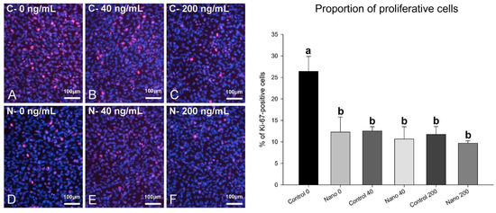 Epifluorescence imaging of Ki-67 labeling (left panel) and proportion of proliferative MC3T3-E1 cells (right panel) on day 5 of culture on Control-Ti (A–C) and Nano-Ti (D–F) exposed or not on days 2 and 4 of culture to 40 and 200 ng/mL BMP-7 in the culture medium. (A–F) Proliferative cell nuclei have red fluorescence (Ki-67+), and all cell nuclei are labeled with DAPI (blue fluorescence). Bars with different letters are significantly different from each other (p < 0.05).