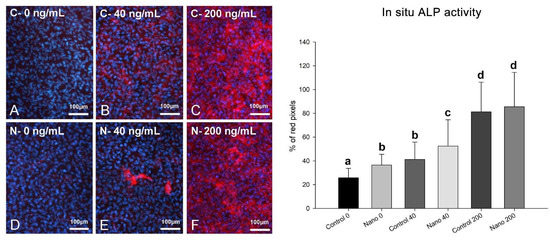 Epifluorescence imaging of Fast Red staining (left panel) and in situ ALP activity (right panel) of MC3T3-E1 cells on day 5 of culture on Control-Ti (A–C) and Nano-Ti (D–F) exposed or not on days 2 and 4 of culture to 40 and 200 ng/mL BMP-7 in the culture medium. (B,C,E,F) Whole-cell red fluorescence (Fast-Red-stained cells) indicates in situ ALP activity, and cell nuclei blue fluorescence indicates DAPI DNA stain. Bars with different letters are significantly different from each other (p < 0.05).