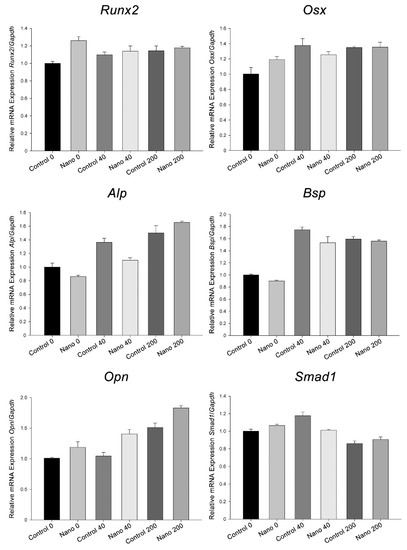 Runx2, Osx, Alp, Bsp, Opn, and Smad1 mRNA expression levels normalized to Gapdh in MC3T3-E1 cell cultures grown on Control-Ti and Nano-Ti on day 5 of culture, exposed or not on days 2 and 4 of culture to 40 and 200 ng/mL BMP-7 in the culture medium. The bars represent one biological replicate (resulting from the pooling of 16 independent wells/experimental replicates for each group) run in three technical replicates (mean and SD). The mean value of the control group (Control 0) was assigned the value of 1.