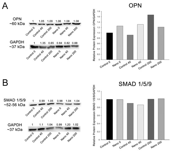 The results represent one technical replicate from the pooling of 20 independent wells/experimental replicates for each group. OPN was detectable in MC3T3-E1 cultures in all the groups, showing higher amounts on Nano-Ti compared to its controls except for at the 200 ng/mL concentration (Figure 5). The phosphorylated SMAD 1/5/9 complex was also detectable in all the groups but in lower amounts when cells were exposed to the 40 ng/mL concentration on both Ti surfaces (Figure 5).