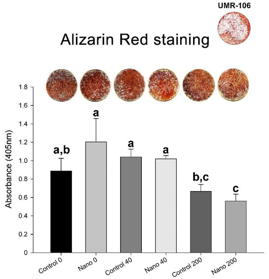Qualitatively, the UMR-106 cultures exhibited an osteogenic phenotype in all the groups (Figure 6). Quantitatively, the results of the Alizarin Red staining showed no significant differences between the groups with the absence of BMP-7 or its 40 ng/mL supplementation. However, 200 ng/mL BMP-7 supported lower mineralization for both Control-Ti and Nano-Ti (Figure 6).