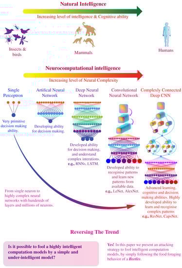 The level of intelligence, learning, and cognitive ability possessed by living beings is directly associated with the structural complexity [,] and the size of the brain [,,]. Human brains demonstrate an excellent ability to discover, learn, and recognize intricate patterns because of complex interconnection between neurons []. The complexity of the neural structure of the human brain has inspired the development of artificially intelligent learning systems [,,,,], which are rapidly coming at par with the performance of human brain itself [,,]. As shown in Figure 1, on the other end of the biological intelligence spectrum, lies small organisms e.g., worms and insects, which demonstrate an rudimentary-intelligent behavior and limited learning ability [] because the neurological structure is not complex enough to develop intelligent reasoning. However, in this paper, we demonstrate a counter-intuitive result that an artificial learning system, inspired by the human brain, can be fooled by following a straightforward algorithm inspired by the behavior of an insect. More specifically, the proposed algorithm is inspired by the Beetle Antennae Search (BAS) algorithm based on the food foraging behavior of beetles [,,,]. This simple algorithm can successfully fool a deliberately designed and extensively trained Convolutional Neural Networks (CNNs) to make the wrong decisions for recognizing objects in input images. We anticipate that the presented results will provide further insight into the nature of artificial learning systems. Furthermore, these results create important implications for the security and robustness of the intelligent computation models and how it will affect the future of artificial intelligence, particularly since such systems are being widely used in commercial products [,,,,].