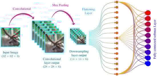 CNNs belong to a special type of neural networks, designed specifically for learning the features on visual data, e.g., images. The architecture of CNNs allows taking advantage of spatial correlation between a neighboring pixel of the images, a feature lacking from a simple feedforward neural network. In CNNs, the input of the network is followed by convolutional layers and downsampling layers, before the fully connected layers, to extract useful image features efficiently. A typical CNN is shown in Figure 2. It is a simple CNN architecture with a convolutional layer, a downsampling layer, and a fully connected layer followed by a softmax layer to output probabilities of the image belonging to a particular class.