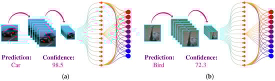 Prediction of a trained simple CNN network on real-world images. (a) The network predict that the input image is a car with a confidence of 98.5%. (b) The network predict that the input image is a car with a bird of 98.5%.