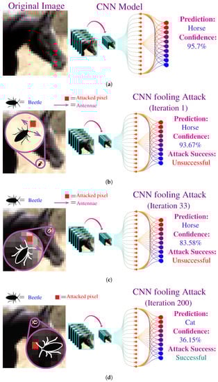Figure 6 illustrates the proposed attacking strategy. The CNN model takes a RGB image as input and outputs the class of objects present in the image, i.e., horse, dog, car, etc. For the demonstration of the fooling algorithm, we used bettle with just two antennae. The original input image contains a horse. Figure 6a shows the CNN correctly predicts the class to be a horse for the original with the confidence of 95.7%. Then we start the iterations of our fooling algorithm by initializing the algorithm at a random pixel location. Figure 6b shows the modified image after the first iteration; the modified pixel is highlighted in red. At this iteration, CNN still predicts the correct class, but the confidence of reduced to 93.67%. Figure 6c shows further decrease in confidence after a mere 32 iterations. Finally, the beetle is able to find a pixel to fool the CNN after 200 iterations, as shown in Figure 6d. The network is fooled into predicting that the input image contains a cat, whereas, in reality, only one pixel of the input image is modified.