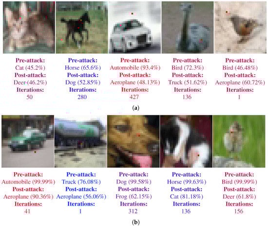 Samples of single pixel successful targeted attacks on both LeNet-5 and ResNet architectures. Perturbed pixel is marked as red. The pre-attack, post-attack predictions and confidences along with the number of iteration required to fool the CNN are also shown below the images. (a) Samples for LeNet-5. (b) Samples for ResNet.