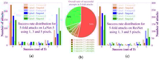 Statistics of the attack success rate for all experimental scenarios. (a) The histogram shows the success rate distribution in 5-fold attacking experiments for LeNet-5. Random images from the CIFAR-10 test dataset are attacked five times each using 1,3 and 5-pixels, and the number of successful attempts is recorded as shown in the histogram. The targeted attacks have a lower success rate as compared to untargeted attacks. Additionally, as the number of attacked pixels increases, the success rate also improves. (b) The proportion of successful and unsuccessful attacks for all of the experiments. (c) Success rate distribution for ResNet in both targeted and untargeted attacks.