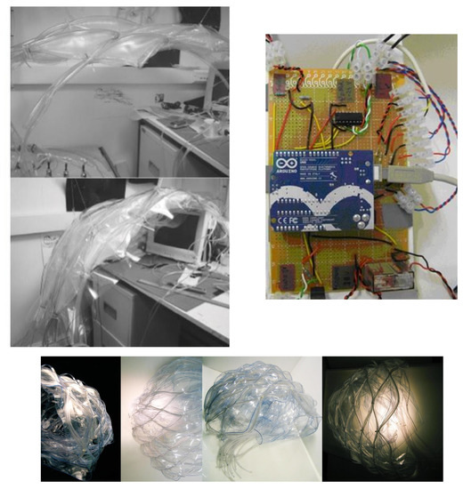 (top left) Dynamic membrane models at 1:5. (top right) Connections, Arduino for the performance of the 1:5 scale model; Circuit composed by: solenoid valve (18 V), motor (3 V), and several LEDs and several resistances. (Below) Static models scale 1:20.