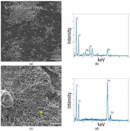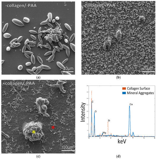 Glass slides incubated in ½ ASW solutions at room temperature. (a) Uncoated collagen slides incubated in solutions containing no polymer displayed large spindle-shaped mineral aggregates on the surface. (b) Solutions containing 20 μg/mL PAA displayed smaller, more granular precipitates, with only a few of the large aggregates. (c) Collagen-coated glass slides under the same conditions as (a) displayed bundles of mineral aggregates on the surface. (d) EDS measurements from sample (c) are shown as the blue spectrum for the large mineral aggregate (marked by the yellow asterisk), with the red spectrum taken from the background region (red asterisk), indicating low mineral deposition on the surrounding collagen surface.