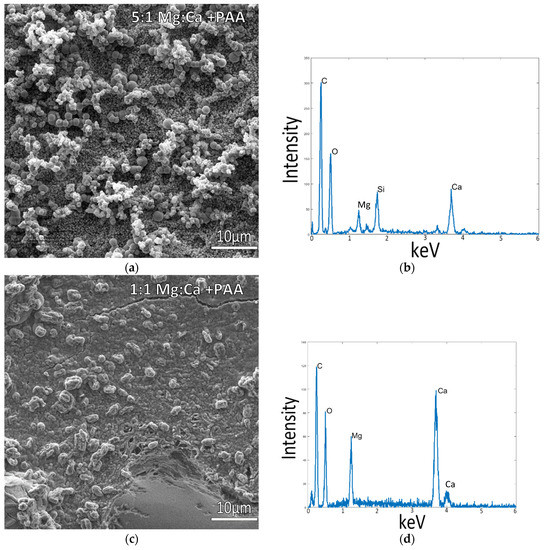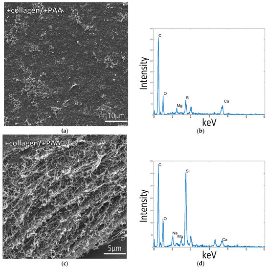 The results show that both mineralization temperature and solution composition play a role in the effective mineralization of collagen in the presence of process-directing agents. The incorporation of charged polymers as process-directing agents is one factor that is essential to the mineralization of collagen fibers, shown by the absence of intrafibrillar mineralization in all samples without PAA, where the mineral instead deposited as a crust on the surface of the collagen film. Solution compositions containing magnesium at higher concentrations (including the 1/2x ASW), resulting in a layer of mineral on the surface of the respective matrices with poor intrafibrillar mineralization of collagen below the surface of the mineral particles and coatings (Figure 4a and Figure 6a). In solutions with CaCl2 and NaCl only, without Mg, and at temperatures of 30 °C and above, the mineral infiltrates into the collagen structure, coating and likely infiltrating the fibrils, as indicated by the SEM images and respective EDS spectra from raised collagen portions on these samples (Figure 4c,d and Figure 5c,d).