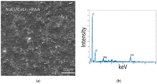 Collagen-coated glass slide incubated at 150 mM NaCl + 10 mM CaCl2 concentrations with PAA in solution, at room temperature. (a) The flat collagen surface and lack of precipitates, as well as the low calcium signal in the EDS spectrum (b), indicate relatively low mineral deposition on the collagen surface or within the fibrils.