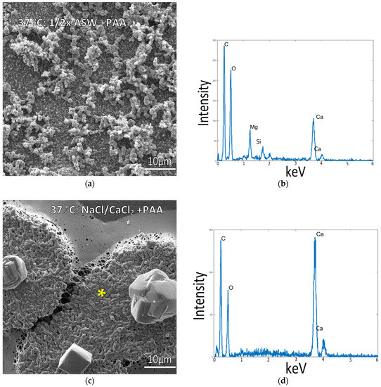 Given the lack of intrafibrillar mineralization created by any of the room temperature conditions, we decided to examine the mammalian physiological temperature of 37 °C since the type 1 collagen used here is from a bovine source. Samples incubated in the standard ½ ASW + PAA mixes at 37 °C displayed a thick layer of micron-sized mineral aggregates coating the surface (Figure 4a). Even though the precipitates appear to be a mixture of both spherules and granular precipitates, the XRD analysis found only the aragonite phase (Supplementary Figure S1e). In contrast, samples incubated in solutions of NaCl and 10 mM CaCl2 containing PAA (without Mg) displayed raised patches, which were regions created by plumped-up collagen fibrils that were well infiltrated with minerals (Figure 4c). This is typical of intrafibrillar mineralization, where mineral displaces the water within collagen fibrils, keeping them from collapsing upon drying [29,38]. This is further evidenced by the large Ca peak in EDS in a region where no crystals or mineral coating are visually seen (Figure 4d), indicating the mineral is hidden within the fibrils. Agglomerates of the mineral were also present on most of these mineralized patches, but they appeared to be comprised of just a few distorted rhombs of calcite. The XRD pattern surprisingly shows a mix of aragonite and calcite phases, even though the solution did not contain Mg ions (Supplementary Figure S1f). Interestingly, these rhombs were nearly always in the center of the raised patches of mineralized collagen (Supplementary Figure S2 and Graphical Abstract images), appearing to be caused by a “spherulitic” mineral propagation pattern analogous to that recently reported by Macías-Sánchez et al. for mineralized collagenous tissues such as bone, dentin and turkey tendon [48]. Given the centralized rhomb seen in all of the raised patches, it appears the rhomb may serve as a collection site that accumulates the mineral precursor droplets. We have previously observed that CaCO3 PILP droplets preferentially adsorb onto existing mineral particles [49], sometimes accumulating into tower-like aggregates (unpublished observations), while other times forming bumpy coatings that sprout off mineral nanofibers [50]. In the work here with the underlying collagen matrix, it is unclear how such an accumulation site would transfer precursors to the surrounding matrix.