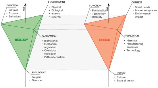 In this perspective, a technical product can be considered a system that must “adapt” to several constraints, i.e., boundary conditions. Following the same scheme of constructional morphology, a product design can “evolve” from the interaction between several key factors: history, function, fabrication, and context (Figure 1). The historical factor depends on the design culture and the state of the art in its specific sector. It influences the development of the product and its “evolution” up to the present, determining its shape and function and representing the basic scheme for the development of new functional aspects or modifications. This factor can be evaluated through the analysis of technical necessity, product design history, state of art, and market analysis. The functional factor is related to the proper functioning of the product, including all internal and external mechanisms (e.g., mechanical, electrical, and chemical systems contributing to the functioning of the product). This factor also reflects the functional adaptation of the product to changing technology, societal needs, lifestyles, functionalities, and usability. Products acquire and lose details in their configurations according to expressed and unexpressed functional necessities. The fabrication factor concerns the manufacturing processes, i.e., the limits imposed by materials, fabrication practices, and technology. For example, the manufacturing process of aluminium restricts the shape of the final product compared to the introduction of 3D printing, which permits the realisation and proliferation of highly complex organic shapes (e.g., anisotropic porosity, honeycombed structures, hierarchical and layered morphologies), otherwise impossible to obtain using previous traditional methods [,]. The contextual factor is determined by societal and market influences that constrain product shape, working principles, fabrication, and “evolution” (e.g., interior or exterior design destination, industry and market requirements, society preferences and trends). As environment is the selection factor for organisms, so social needs and market (i.e., users) accomplish the final selection of newly developed designs determining their success and replication (e.g., from limited to mass production). Fortunately, the environment is also assuming a central role in product selection in terms of eco-compatibility and environmental impacts to assure a sustainable development. In this regard, the inspiration from natural systems and processes has a great potential for effective transitions from a human-centred to an environment-centred design []. The use of these boundary conditions can provide designers with a critical and operational framework on which they can carry out the analogical steps necessary for the transfer from natural to artificial dimensions.