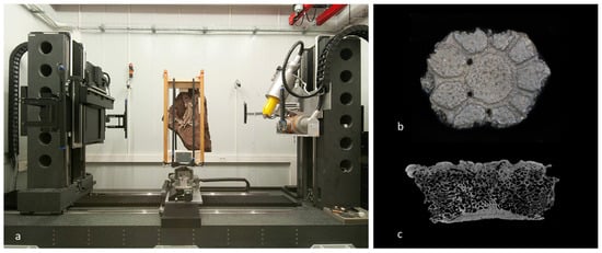 Presently, it is possible to develop this Paleomimetic design process due to recent technological advances that provide (i) high fidelity in the capture of past models, (ii) greater reliability of results from numerical simulations, and (iii) high reproducibility of complex computer-aided design (CAD) models with digital manufacturing techniques [,]. High-fidelity 3D CAD models of fossilised structures can be acquired using various techniques, such as structure-from-motion (SfM) digital photogrammetry, 3D laser scanning and computed tomography, or microtomography (μCT) [,,,]. Each technique differs in geometric and volumetric resolutions of the model provided; thus, the choice of a technique greatly varies in relation to the investigation necessary. SfM photogrammetry, a computer vision technique, allows the recreation of a fossil surface in 3D CAD format using 2D digital photographs [,]. This reconstruction process can be completely automatised by specialised software (e.g., Agisoft PhotoScan or 3DF Zephyr) directly producing a 3D CAD millimetric geometric resolution. However, depending on the method used and personal expertise, better quality models can also be obtained when compared with the more automated techniques. For example, 3D laser scanners provide the direct acquisition of 3D geometric models of surface samples with resolutions ranging from a centimetre to a sub-millimetre []. By rotating the laser scanner, the position of hundreds of thousands of points are detected, defining the biological structure surface. Based on the detection speed and rotation steps, it is possible to control the scanning resolution [], i.e., the density of the points detected at a defined distance, as well as the quality of the data acquired: the slower the rotation, the higher the resolution []. In the literature, comparisons between photogrammetry and laser scanning are available, e.g., [,]. Computed tomography provides more detailed reconstructions of samples through the acquisition of a series of sliced structures, organs, and tissues based on their density, which are detected using an X-ray beam [] (Figure 2a). A high-resolution micro-computed tomography can scan samples of ten or less micrometres (Figure 2b,c). By combining the various sliced sections with ad hoc reconstruction software, it is possible to obtain a geometric (geometry-based reconstruction) and volumetric (voxel-based reconstruction) 3D model of the analysed sample [].