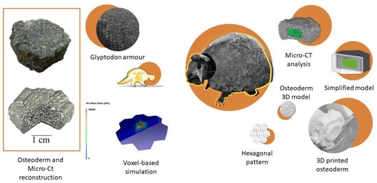 In virtual palaeontology, an additional interesting tool is the use of additive manufacturing, including 3D printing, which could also be a pivotal instrument to characterise and replicate structures for future Paleomimetic transfers [,]. Three-dimensional printing is based on a computer-controlled process creating volumetric objects by depositing layers of material []. This process is generally flexible and allows the fabrication of a CAD model with good resolution and control on the resulting geometric shape []. Digital models of fossil entities obtained from the photogrammetric, light, and CT scan reconstructions can be 3D printed, creating physical models that can be scaled, observed, and/or tested, allowing an in-depth analysis of morphological and structural details. In this regard, an interesting example is the study of Glyptodon (early Miocene–Late Pleistocene), extinct mammals of the Cingulata order, which includes modern armadillos [] (Figure 3). Glyptodon carapace consisted of osteoderms with a lattice core sandwiched between two compact layers. Starting from a micro-CT, the structure was reconstructed and recreated in simplified, reverse-engineered models. These models were 3D printed and tested by varying lattice and shell parameters. Results demonstrated that shell thickness was optimised compared to lattice density and lattice strut thickness []. Three-dimensional printing is useful not only for the study of extinct and existent organisms, but also for the opportunities to mimic their complex multiscale, multimaterial, and multifunctional structures []. Recent advances in material, process, and instrumental developments have enabled the evolution of additive manufacture processes to evolve from prototyping to manufacturing. Accordingly, numerous 3D-printed biomimetic materials, structures, and devices inspired by organismal design with mechanical, optical, electric, interactive, and adaptive properties have been developed. Fascinating examples are reported in the review elaborated by Yang et al. [] and du Plessis et al. [], in which they provide examples of recent progress and different forms of biomimetic engineering now possible using these technologies.