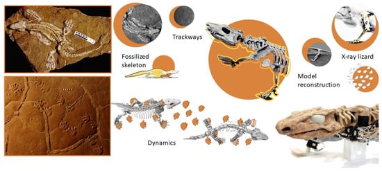 - Nyakatura, J.A.; Melo, K.; Horvat, T.; Karakasiliotis, K.; Allen, V.R.; Andikfar, A.; Andrada, E.; Arnold, P.; Lauströer, J.; Hutchinson, J.R.; et al. Reverse-engineering the locomotion of a stem amniote. Nature 2019, 565, 351–355. [Google Scholar] [CrossRef] [PubMed]