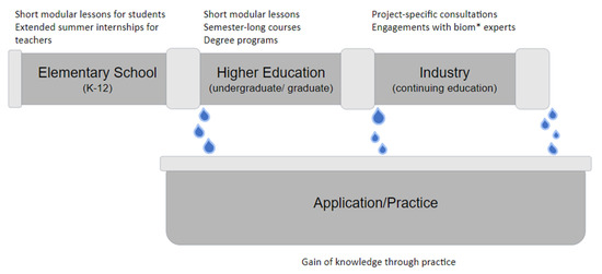 Yet, the development of education programs across sectors, from formal graduate education to workshops offered by for-profit organizations, if considered together, may offer solutions to some of the long-standing challenges faced by proponents and practitioners of biom* (e.g., [46,47,48]). In this paper, we begin by summarizing the state of biom* education in each of these sectors, i.e., K-12 education, undergraduate, graduate higher education, as well as extra-formal education, like training. Then we assemble a list of challenges from industry using a variety of sources. We then deduce their educational implications and seek examples of sectors or practices that address these challenges in hopes of connecting problems to potential solutions.