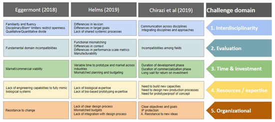 Engaging in biom* activity involves complex research, development, and commercialization with many opportunities for failure along the way that may not be directly associated with the complexities of biomimetics per se. Though academic researchers have been focused on the challenge of knowledge transfer (i.e., [4]), it is important to account for the challenges experienced by practitioners. Here we present an integration of three sets of challenges (Figure 2), with some additional elaboration for each category. We then derive the educational implication for these challenges and identify locations along the education pipeline that may be best suited to address them.