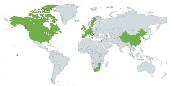 Geographical distribution of practitioners who shared industry challenges (green), based on [62]. Image created with mapchart.net, CC-BY-SA.