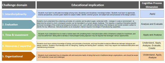 What becomes clear with the integration of these industry challenges is that the superdiscipline of biomimetics [7] itself has advanced considerably over the past decades. Challenges experienced in the infancy of biom* focused on ‘how to do biomimetics’, and now we are challenged with how to do it efficiently, more deliberately, or more frequently. From here, we can look at how the biom* education pipeline either contributes to creating these challenges or may become a source for mitigating them by first deriving the educational implications of these Challenge Domains, shown in Figure 4.