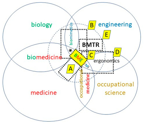 Activities of biomechatronics in relation to the related scientific fields (dashed circle). BMTR: biomechatronics; BME: biomedical engineering; HMI: human–machine interaction; Asterisk *: engineering for biology (“E4B”).