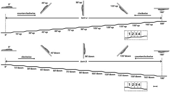| periodic trapezoid tilting | maintain attachment during the 0–105° nose-up rotations and the reverse in turn a, as well as the 0–60° nose-down rotations and the reverse in turn b | Yes (maintain attachment in turn a, as well as in turn b) | maintain attachment during the 0–120° (n = 5) and the 0–135° (n = 7) nose-up rotations and the reverse in turn a, as well as the 0–90° (n = 5) and the 0–105° (n = 7) nose-down rotations and the reverse in turn b |
