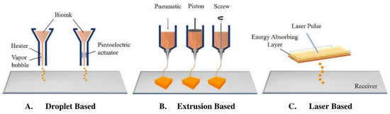 The three types of bioprinting: (A) Droplet-based, (B) Extrusion-based, and (C) Laser-based. Figure is adapted from Tamay et al., 2019 [81].