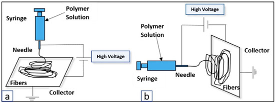 Electrospinning setup for fibrous mesh formation, shown using both (a) vertical and (b) horizontal spinning [105].