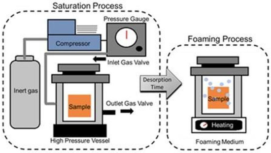 Depiction of the use of a gas foaming agent, high pressure, and high temperature to develop a gas foamed scaffold. The saturation process involves spreading the gas throughout the polymer sample inside a high-pressure vessel or reactor. Once the sample is saturated, it can be placed in a high temperature chamber to allow for desorption. Figure is adapted from Toong et al., 2020 [112].