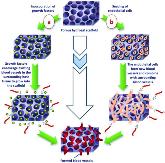 Vascularization of hydrogel scaffold completed by the incorporation of (a) regulatory growth factors or (b) endothelial cells into the tissue-engineered structure [116].