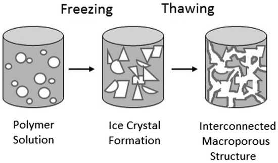 For cryogel fabrication, gel precursors are first crosslinked, either physically or chemically, and then subsequently frozen. Cryogel synthesis primarily occurs in the frozen state, including the chemical reaction leading to gelation [133,134,135,136]. The temperature for freezing typically ranges between −5 and −20 °C, as this is the common range for solvent crystallization. The resulting solvent crystals act as porogens, surrounded by the hydrogel constituents which remain in liquid micro-phase [135,137,138]. Following freezing, the cryogel is thawed at room temperature, where the ice crystals melt out, leaving an interconnected, macroporous structure [134,135,137,138,139,140,141]. Note that the pores become rounded upon hydration due to the liquid and pore wall surface tension. An overview of the cryogel fabrication process is shown in Figure 6.