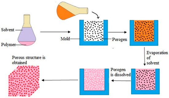 SCLP involves the casting of an organic polymer solution, containing a crosslinker and salt particulates (porogens), into a mold [154]. Porogen agents commonly used include sodium chloride [156,157], ammonium bicarbonate [158], and glucose [159], where different porogen material yields varying crystal sizes. For fabrication, first the polymer is dissolved in an organic solvent. This solution is then combined with a porogen and transferred to the mold, such as a Petri dish. Once the solution solidifies, the solvent is removed from the solution via evaporation or lyophilization, leaving behind the porogen within the polymer structure. The porogen is then “leached” out by immersion in an aqueous bath which dissolves the particles/salt within the matrix [160]. Figure 7 provides an overview of this process.