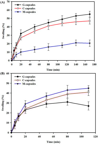 Swelling behavior of G-capsules, C-capsules, and M-capsules: The swelling behavior of capsules in (A) simulated gastric fluid (pH 2) and (B) simulated intestinal fluid (pH 7.2) as a function of time.
