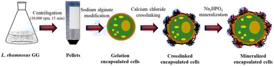 Schematic illustration of the encapsulation of L. rhamnosus GG: The L. rhamnosus GG cells obtained through centrifugation of broth were modified with a single layer of polyanionic sodium alginate (i.e., gelation), followed by the formation of a polycation layer by adding calcium chloride (i.e., crosslinking) and, finally, forming a layer of disodium hydrogen phosphate (i.e., mineralization).